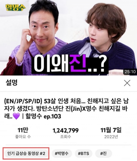 지난해 11월 7일 할명수에는 '53살 인생 처음... 친해지고 싶은 남자가 생겼다. 방탄소년단 진(Jin) X 명수 친해지길 바래..♥'라는 제목으로 진이 출연한 영상이 공개됐으며 유튜브 인기 급상승 동영상 2위에 오르는 등 뜨거운 반응과 화제를 모았다.