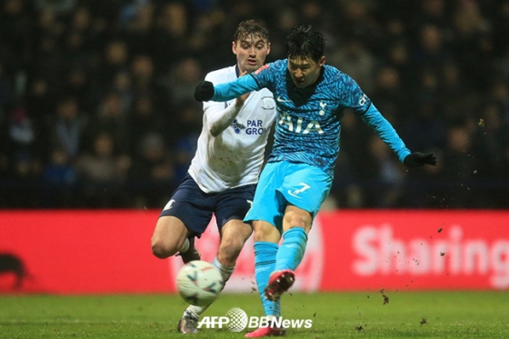 토트넘 손흥민이 29일 프레스턴과의 FA컵 4라운드 두 번째 득점으로 이어진 슈팅 순간 . /AFPBBNews=뉴스1