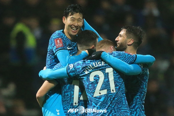 토트넘 손흥민이 29일 프레스턴과의 FA컵 4라운드에서 득점에 성공한 뒤 동료들과 기뻐하고 있다. /AFPBBNews=뉴스1
