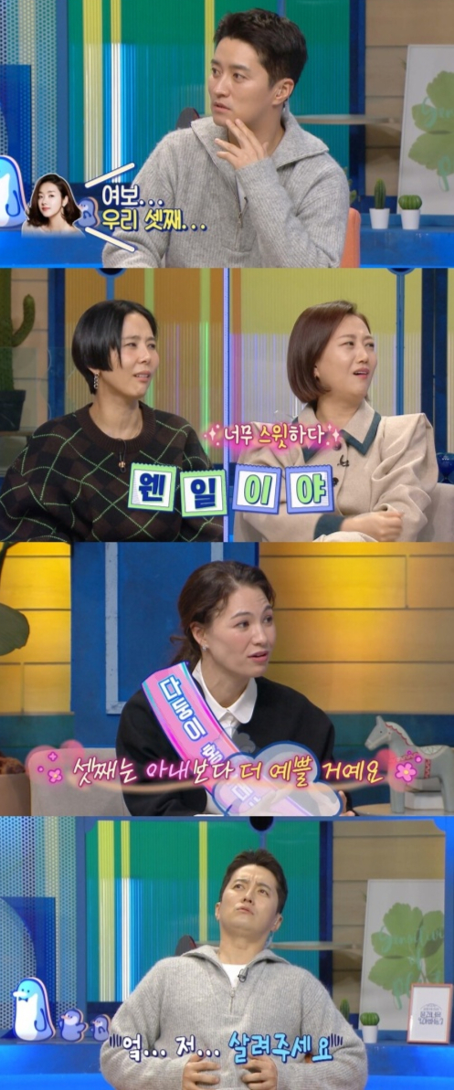또한 "아이들 다 키우고 이제 아내랑 이야기 좀 하고 시간 보내고 싶은데 여기서 셋째가 생기면 아내랑 어떻게 될까? 아내가 배가 불러서 1년, 병원에서 보내고 마음이 너무 아프다"라며 울컥했다. 이에 장윤정과 김나영은 "그 이야기 하면서 울먹인다, 울어요?"라며 놀렸다.