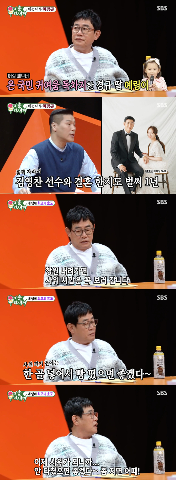 이경규는 또 사위 김영찬에 대한 애정을 드러냈다. 이경규는 "시합도 몇 번 보러 갔다. 창원 내려가면 사위 시합은 꼭 가서 본다"고 밝히며 "확실히 경기 볼 때 사위 되기 전과 후가 다르더라. 사위 되기 전에는 수비수지만 한 골 넣어서 떴으면 좋겠다 생각했는데 이제 사위가 되니까 안 다쳤으면 좋겠다. 좀 지면 어떻냐"고 덧붙여 훈훈함을 더했다.