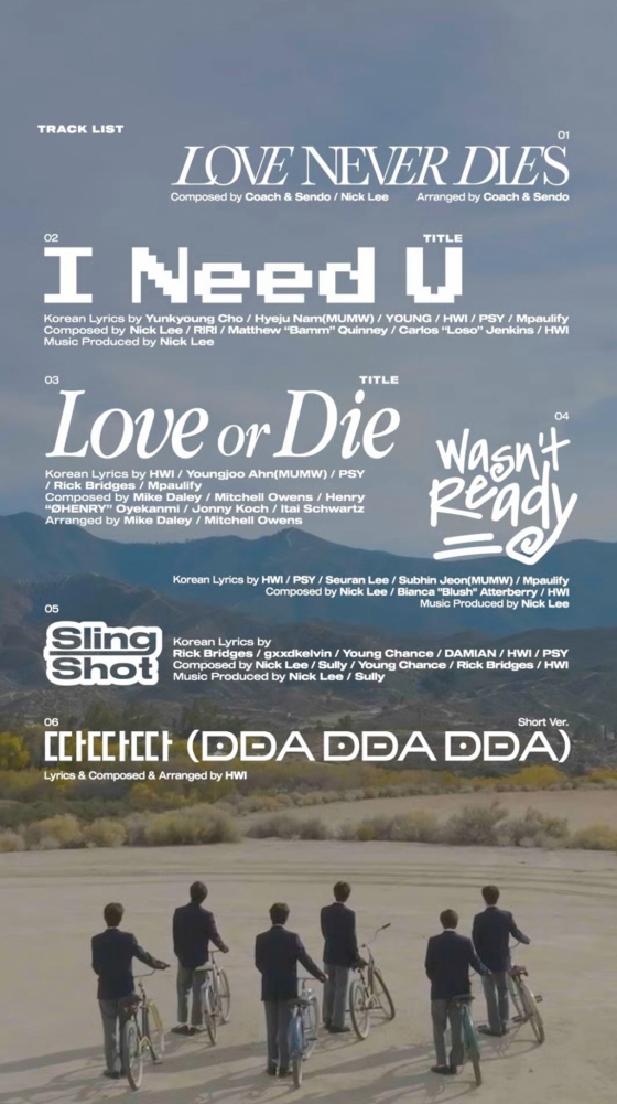이날 공개된 트랙리스트에 따르면 'Love Never Dies'에는 더블 타이틀곡 'I Need U'와 'Love or Die'를 비롯해 앨범명과 동명의 수록곡 'Love Never Dies', 'Wasn't Ready', 'Slingshot', '따따따 (Short ver.)'까지 총 6곡이 수록됐다.