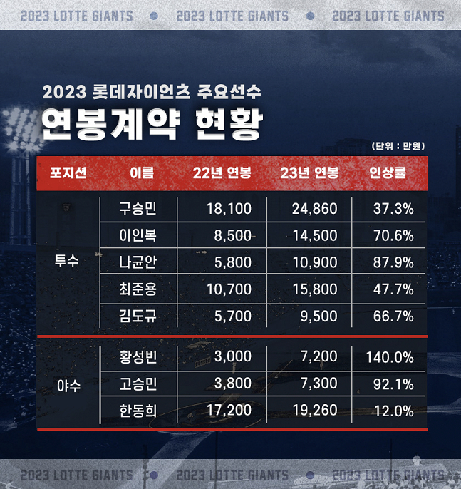 야수진에서는 황성빈과 고승민이 각각 140%, 92.1% 인상율을 기록하며 7300만원과 7200만원에 계약을 체결했다.