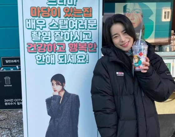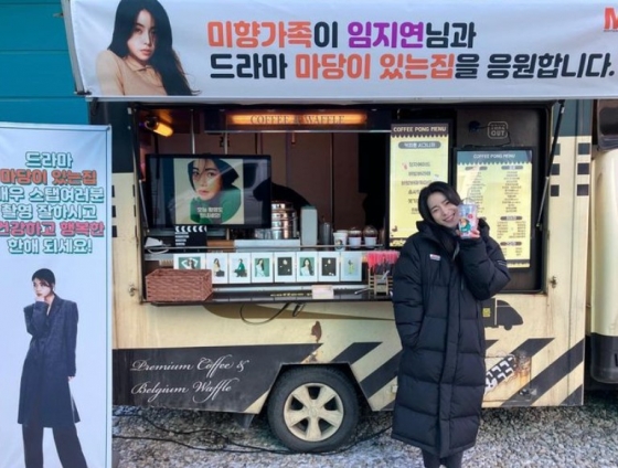 사진에서 임지연은 롱 패딩을 입고 선물로 받은 커피차 앞에서 포즈를 취하고 있다. 커피차 위에는 '드라마 마당이 있는 집 배우 스탭 여러분 촬영 잘 하시고, 건강하고 행복한 한해 되세요'라는 플랜카드도 걸렸다.