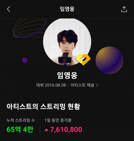 임영웅은 이날 기준 누적 스트리밍 65억 4만을 기록했으며, 일일 스트리밍 증가량은 761만 800이었다.