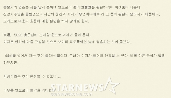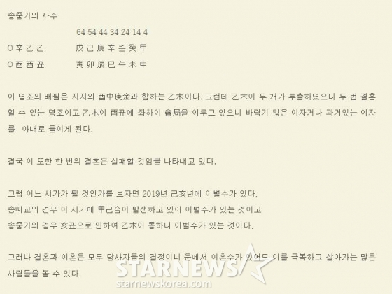 또 그는 송혜교의 사주에 대해 "배필과 해로할 수 없다"며 두 사람 사이에 "2019년에 이별수가 있다"면서 "그러나 결혼과 이혼은 모두 당사자들의 결정이니 운에서 이혼수가 있어도 이를 극복하고 살아가는 많은 사람들을 볼 수 있다"고 작성했다.