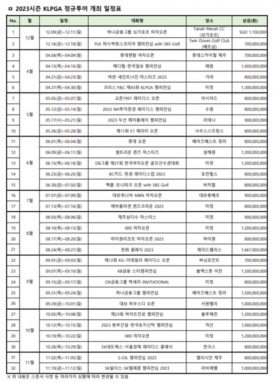 한국여자프로골프협회는 31일 2023시즌 KLPGA 정규투어 일정을 발표하면서 "대회 수 32개, 총상금 약 311억 원, 평균 상금 약 9억 7000만 원의 역대 최대 규모로 열린다"고 밝혔다.