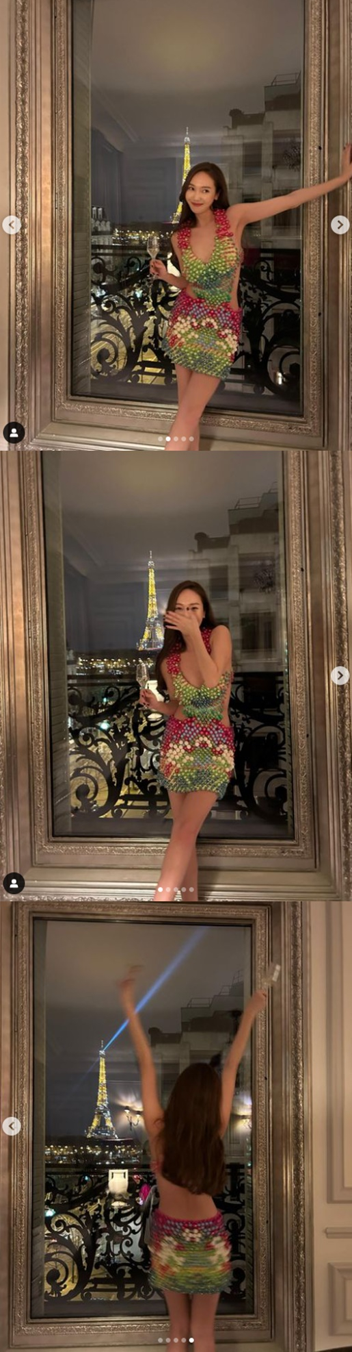 공개 된 사진 속 제시카는 에펠탑이 보이는 창가 앞에서 포즈를 취하고 있다. 마치 과일로 만든 듯한 독특한 디테일의 미니 드레스는 몸매를 그대로 드러낸다.