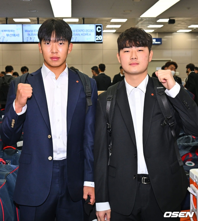 롯데 신인 김민석(왼쪽)과 이태연이 1일 김해국제공항에서 스프링캠프지인 미국 괌으로 출국하기 전 포즈를 취하고 있다.