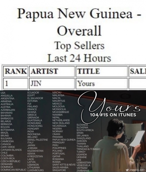 진의 첫 솔로 OST '유어스'는 1월 29일 파푸아뉴기니(Papua New Guinea) 아이튠즈 톱 송 차트에서 1위를 기록했다. '유어스'는 아이튠즈에서 인도네시아를 시작으로 미국, 프랑스, 일본 등에 이어 파푸아뉴기니에서도 정상에 오르며 총 104개국 1위를 기록했다.