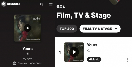 특히 세계 최대 음악 검색 플랫폼인 샤잠(Shazam)에서 진의 '유어스'는 독보적인 롱런 인기를 자랑한다. '유어스'는 1월 31일 기준, 1240만 샤잠을 달성했으며 글로벌 Film,TV 카테고리에서 발매 후 현재까지 TOP3를 유지 중이다. 168일째 연속 1위를 지키는 저력을 과시하고 있다.