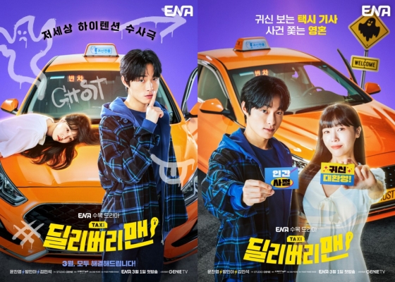 1일 ENA 새 드라마 '딜리버리맨'(극본 주효진·박혜영·한보경, 연출 강솔·박대희) 측이 페어 포스터를 공개했다. '딜리버리맨'은 생계형 택시기사 서영민(윤찬영 분)과 기억상실 영혼 강지현(방민아 분)이 펼치는 저 세상 하이텐션 수사극. 귀신 손님들의 사이다 한풀이부터 미스터리한 살인 사건 추적까지, 세상 어디에도 없는 환장 듀오 영민과 지현의 신(神)들린 수사로 달콤살벌한 재미를 선사한다.