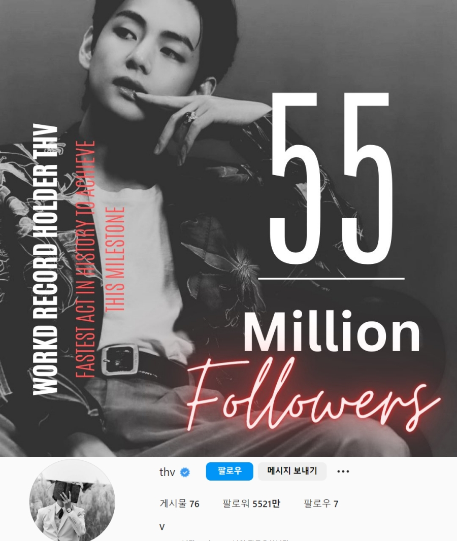 방탄소년단(BTS) 뷔가 인스타그램 역사상 가장 빠른 기록으로 5500만 팔로워를 돌파하며 '소셜킹' 위상을 빛냈다.