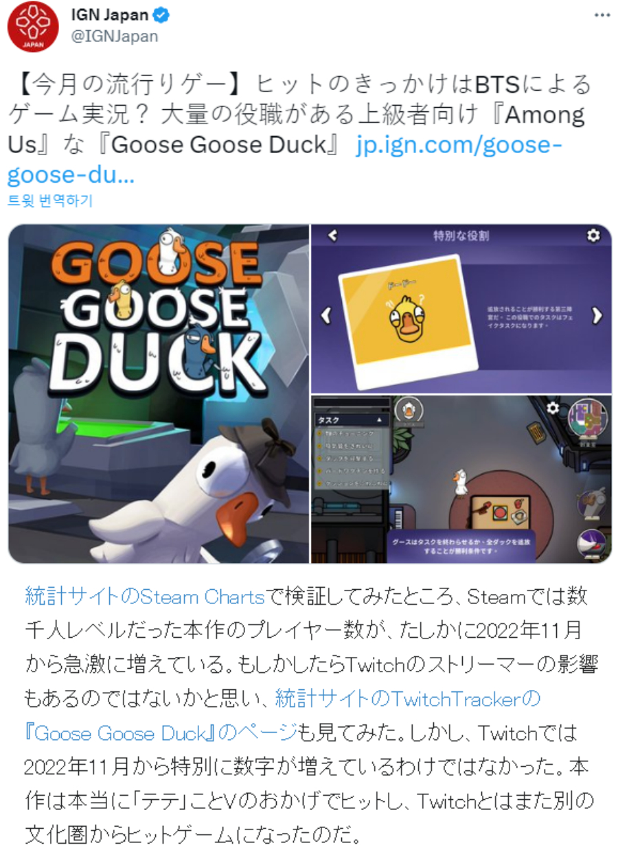 세계 최대 게임미디어 IGN Japan은 기사를 통해 "스팀차트에서 수천명 수준이던 동접자 수가 11월 이후 확실히 급증했다. 같은 기간 트위치 트래커에서는 특별한 수치의 증가가 보이지 않았다. 본 게임은 트위치가 아닌 '태태'의 영향력 덕분에 히트게임이 되었다"고 분석했다.