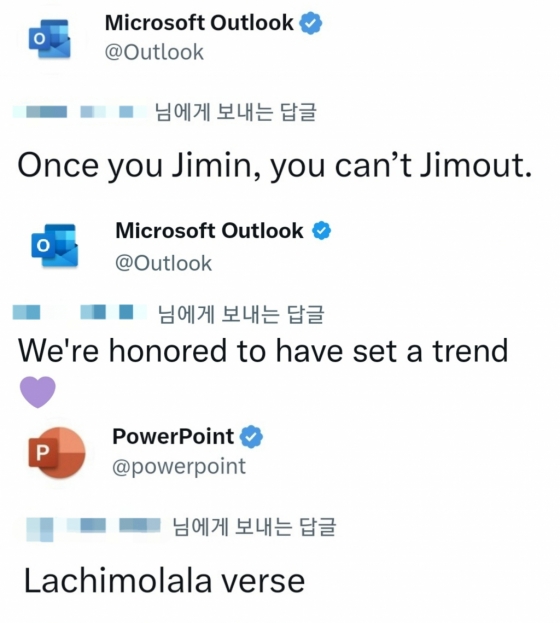 이후 마이크로소프트사의 프레젠테이션 소프트웨어 파워포인트(Power Point)까지 가세해 '아웃룩'의 글에 반응하며 지민의 신조어 '라지벌랄라'를 언급해 팬들이 크게 환호했다.