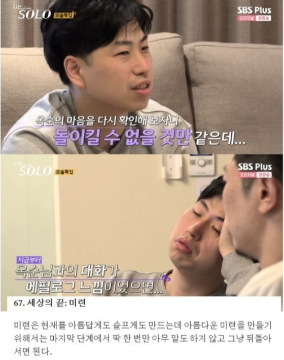 공개된 사진 속엔 12기 광수가 옥순에게 거절당했음에도 불구하고 재차 마음을 전하는 내용이 담겨있다. 또한 "미련은 현재를 아름답게도 슬프게도 만드는데 아름다운 미련을 만들기 위해선 마지막 단계에서 딱 한 번만 아무 말도 하지 않고 그냥 뒤돌아서면 된다"란 문구가 적혀있다. 앞서 방송 당시 시청자들은 12기 광수의 행동을 보고 "집착하는 것 같다"란 평한 바 있다. 9기 영수 역시 이와 비슷한 마음으로 그를 응원했다.