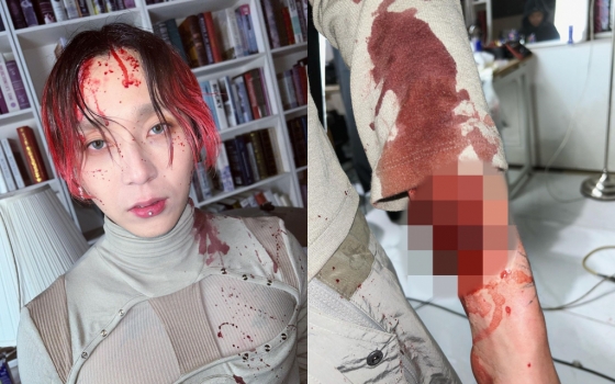 사진 속 던은 새빨간 헤어스타일에 가슴 부분의 타투가 보이는 시스루 의상을 입고 특유의 몽환적인 표정을 짓고 있는 모습. 던은 피투성이가 된 비주얼은 물론, 살이 다 뜯어져 뼈가 보일 듯한 팔을 보여주며 보는 이들을 깜짝 놀라게 만들었다.