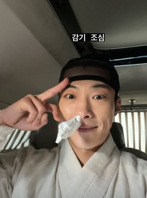 공개된 사진에는 드라마 촬영 의상과 헤어를 한 우도환이 코에 휴지를 꽂고 손 브이를 한 모습이 담겼다. 그는 장난스러운 표정으로 웃음을 자아냈다.