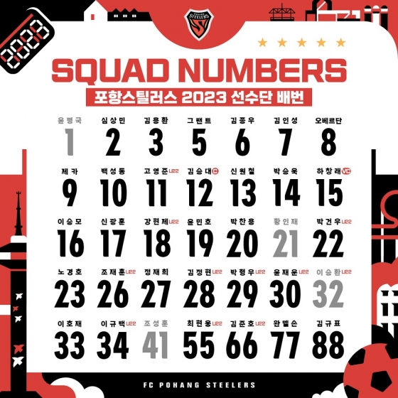 [스포탈코리아] 이현민 기자= 창단 50주년을 맞이한 포항스틸러스가 2023시즌 선수단 배번을 확정했다.