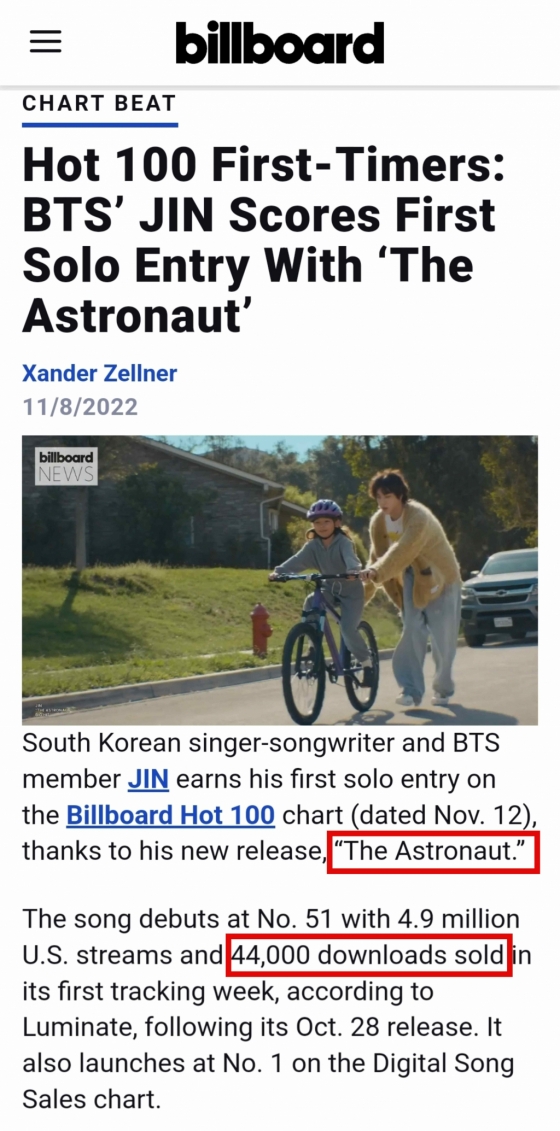 방탄소년단(BTS) 진이 솔로곡 '디 애스트로넛(The Astronaut)'으로 2022년 데뷔 첫 주 미국 빌보드 차트 디지털 세일즈 톱5에 오르며 인기를 빛냈다.