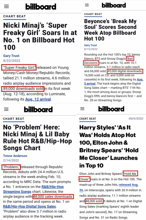 니키 미나즈의 'Super Freaky Girl'은 8만 9000건으로 1위를 기록했으며, 니키 미나즈와 릴 베이비의 듀엣곡 'Do We Have A Problem?'가 4만 8000의 세일즈를 기록하며 미국 전체 디지털 판매량 2위에 올랐다. 3위는 엘튼 존과 브리트니 스피어스의 듀엣곡 'Hold Me Closer'로 4만 8000건의 세일즈를 달성했다.