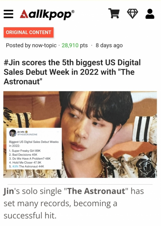 북미 해외매체 올케이팝(Allkpop)또한 이에 주목했다. 올케이팝은 "진은 2022년 'The Astronaut'으로 데뷔 첫 주 미국에서 5번째로 많은 디지털 판매를 기록했다"는 제목의 기사를 게재했다.