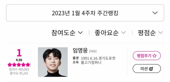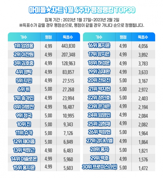 임영웅은 1월 26일부터 2월 2일까지 집계된 아이돌차트 1월 4주차 평점랭킹에서 임영웅은 46만 9083표를 획득, 1위를 차지했다.