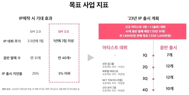 SM 장철혁 CFO는 SM 3.0으로 변화를 통한 멀티 제작센터/레이블 체계 도입의 사업적 효과에 대해 "아티스트와 앨범의 안정적인 출시 pipeline을 확보함에 따라, 2023년에는 3개 신인 그룹, 버추얼 (virtual) 아티스트를 새롭게 선보이며, 이성수, 탁영준 대표이사와 박준영 사내이사가 각각 수장을 맡아 데뷔 프로젝트를 진두지휘 한다. 또한 2022년 대비 30% 증가한 40개 이상 앨범 발매 및 1800만장 이상 판매 실적을 기록할 것으로 예상된다"고 밝혔으며, 이와 같은 CFO의 설명은 향후 재무적인 사업 성과도 챙길 것이라는 SM의 의지를 드러냈다.