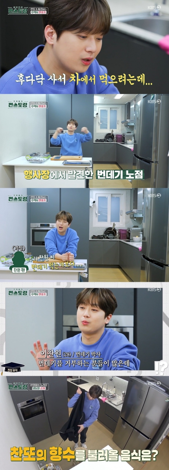 VCR을 본 이연복은 "왜 이렇게 재료가 많이 나오냐. 좋은 재료가 너무 많다"라며 이찬원의 냉동실 재료를 탐냈다. 이찬원은 "저희 아버지가 직접 해서 보내주신 것이다"라고 자랑했다. 이어 이찬원은 "제품 유형 곤충 가공품"이라며 "이 정체가 뭐 냐면 바로 번데기다"라고 재료를 공개했다.