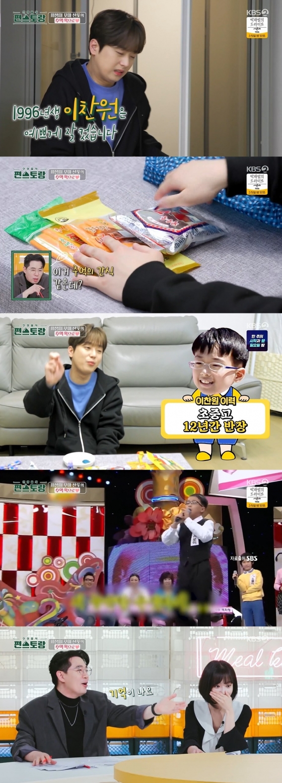한편 이찬원은 12년의 학창 시절 동안 임원 활동을 했다고 공개했다. 이날 이찬원은 추억의 간식을 먹으며 어린 시절을 떠올렸다. 이찬원은 "나 초등학교 때는 어땠었지?"라며 과거를 떠올렸고, "초등학교 때 매해 반장이나 학년 장, 전교회장 같은 걸 했다"라고 경력을 자랑했다.