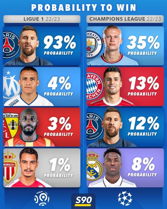 축구 통계 사이트 ‘score90’은 4일 ‘북메이커’의 배당률을 활용해 유럽 5대 리그와 유럽축구연맹(UEFA) 챔피언스리그(UCL) 우승 확률을 공개했다.