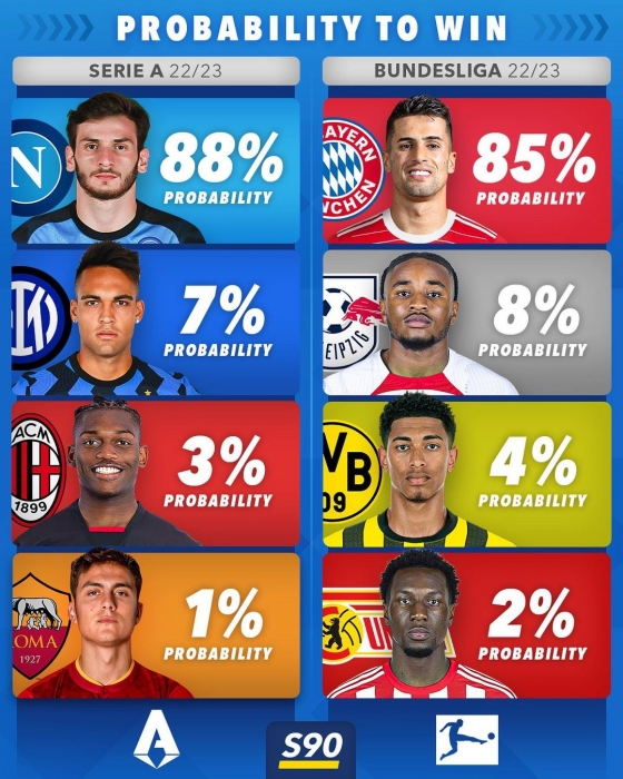 한편, 스페인 프리메라리가, 독일 분데스리가 프랑스 리그1은 각각 바르셀로나, 바이에른 뮌헨, 파리 생제르망이 확률 1위를 기록했다.