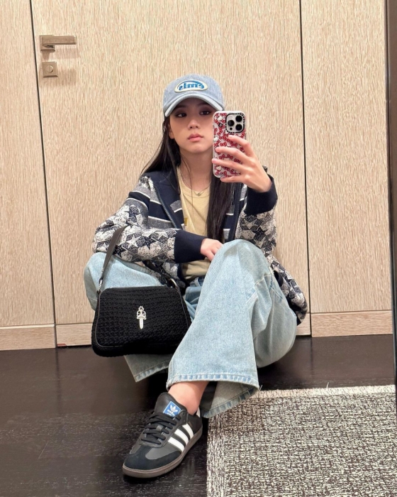 사진에서 지수는 바닥에 반쯤 앉아 거울 셀카를 찍었다. 블루 모자와 재킷, 청바지를 입은 지수는 시크한 미모를 뽐냈다.