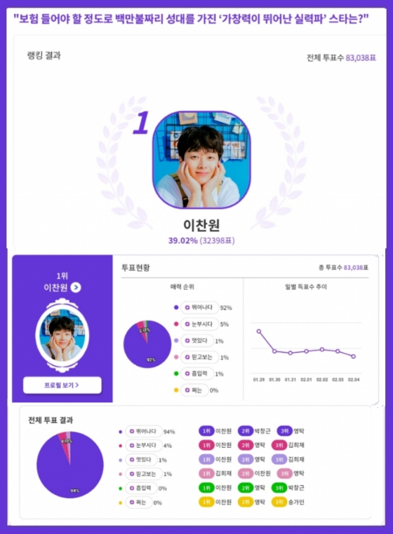 이찬원은 1월 29일부터 2월 4일까지 익사이팅 디시에서 진행된 '보험 들어야 할 정도로 백만불짜리 성대를 가진 '가창력이 뛰어난 실력파' 스타는?' 설문에서 1위를 차지했다.