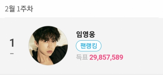 임영웅은 2월 1주차 팬앤스타 솔로 랭킹에서 2985만 7589표를 얻어 1위를 차지했다.