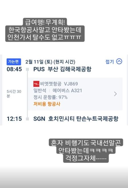이어 공개한 캡처에서 한정민은 홀로 베트남 호치민으로 여행을 계획하고 있음을 알렸다.