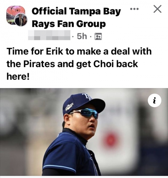 7일(한국시간) 탬파베이의 SNS 공식 팬 그룹 계정에는 "에릭(야구단 사장)은 피츠버그와 협상을 해서 최지만을 다시 탬파베이로 데려오라"고 글이 올랐다. 이에 한 팬은 "최지만은 지난해 부상(팔꿈치)으로 주춤하긴 했지만 건강하기만 하면 팀에 기여도가 높은 선수"라며 "현재 탬파베이가 고려하는 다수의 1루수 옵션보다 최지만을 재영입해 오는 게 더 좋다"고 호응했다.