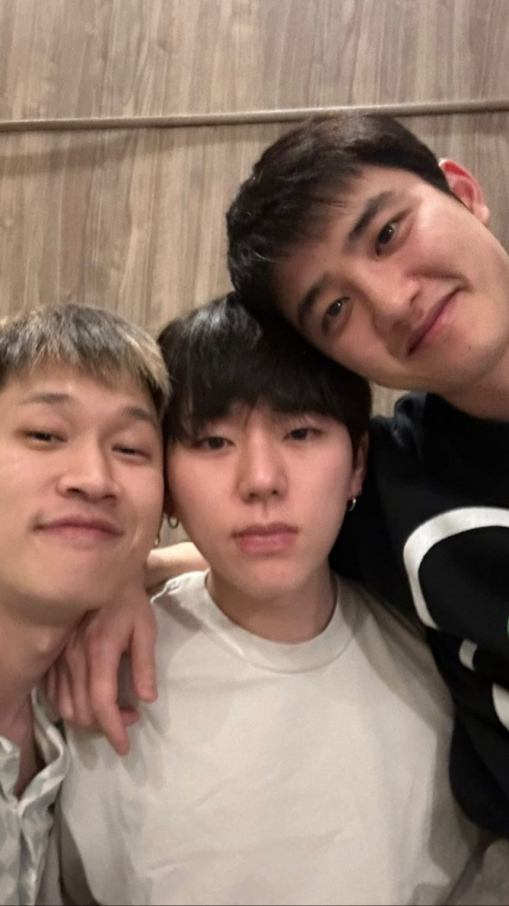 지난 6일 크러쉬는 개인 SNS에 지코, 도경수와 함께 찍은 셀카 한 장을 게재했다.