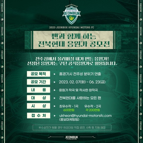 전북은 2월 7일부터 6월 23일까지 약 4개월의 시간을 두고 팬들이 참여하여 만드는 ‘전북현대 응원가 공모전’을 실시한다.