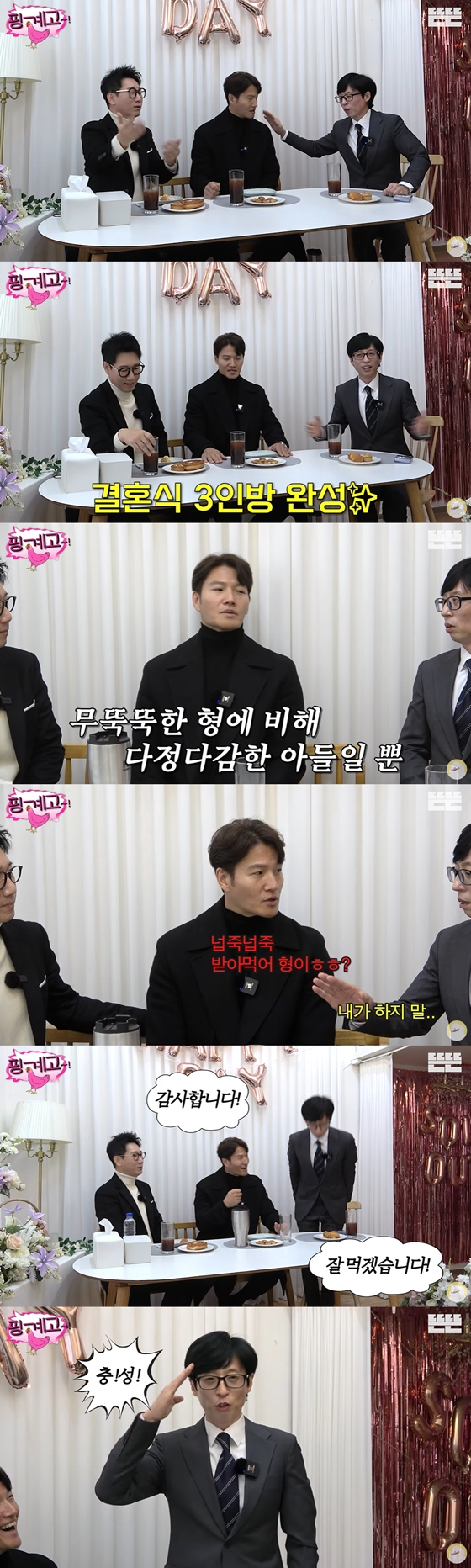 유재석의 말에 김종국이 "넙죽넙죽 받아먹어?"라고 말했다. 그러자 유재석은 자리에서 벌떡 일어나 "잘 먹겠습니다. 충성! 하고 먹지"라면서 "감사한 마음으로"라고 말해 웃음을 자아냈다. 또한 유재석은 아내 나경은이 먹을거리를 잘 챙겨준다고 했다.