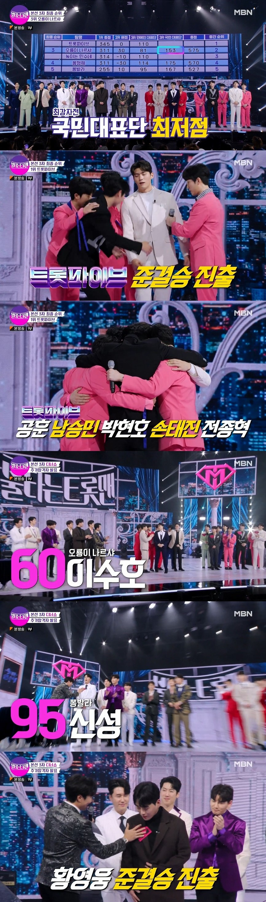 '불타는 트롯맨'에서 3차전 최종 1위 '트롯파이브' 전원 멤버(공훈 남승민 박현호 손태진 전종혁)가 준결승전에 진출했다.