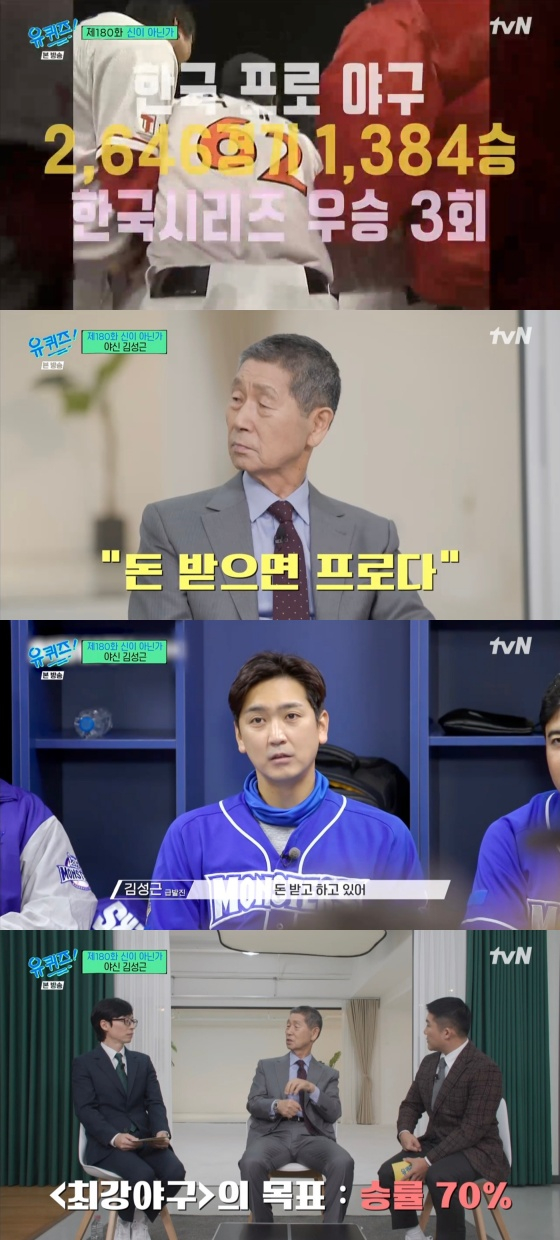 이날 김성근이 '최강야구'에서 했던 말이 언급됐다. 김성근은 방송에서 선수들에 '여러분들은 프로 출신이고 지금 현재도 프로야. 돈 받고 하고 있어. 돈 받는 거는 프로라는 말이야'라고 말했다. 김성근은 "선수들이 시합에서 져서 창피해했다. '돈 받는 건 프로다. 후배들과 세상 사람들한테 뭔가 보여라'했다"며 7할을 목표로 경기를 했고 그게 사람을 움직이게 만들었다고 전했다.