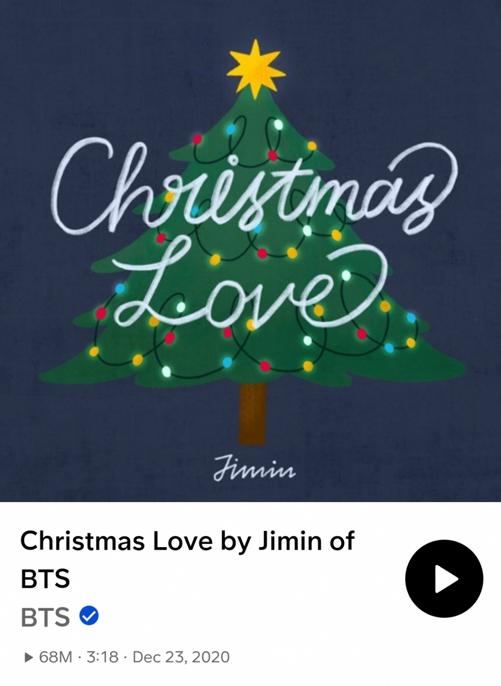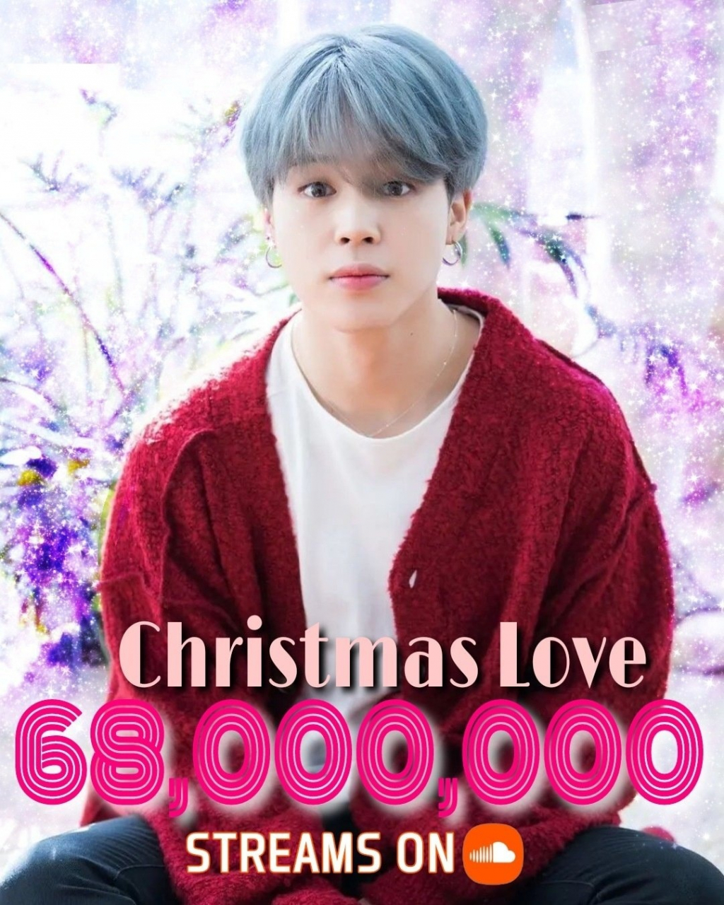 지민의 자자곡 '크리스마스 러브'(Christmas Love)는 글로벌 음원 공유 플랫폼 사운드클라우드에서 6800만 스트리밍을 돌파했다.