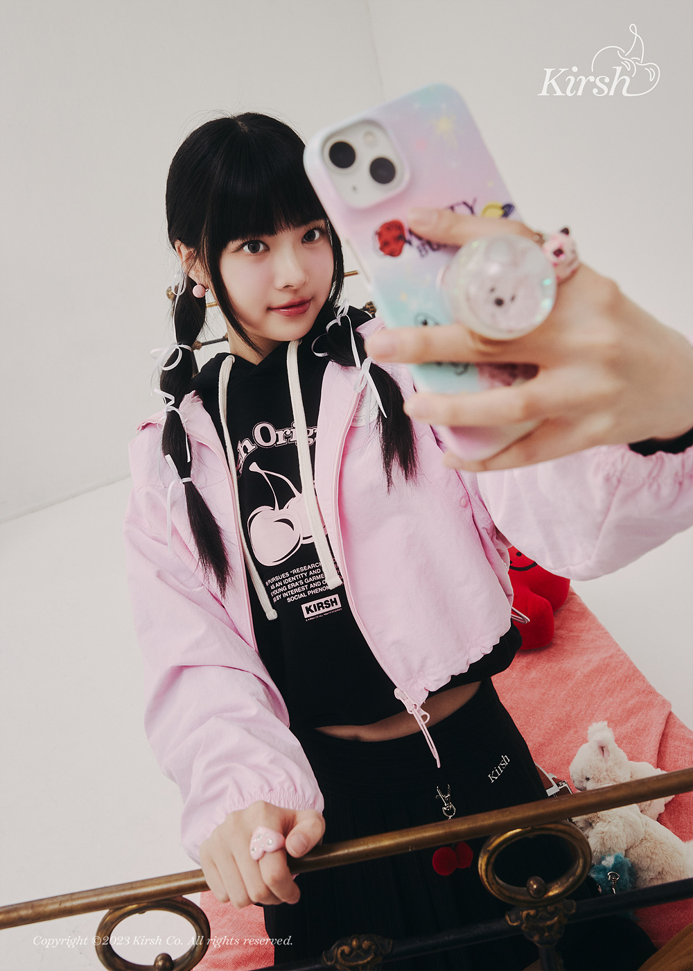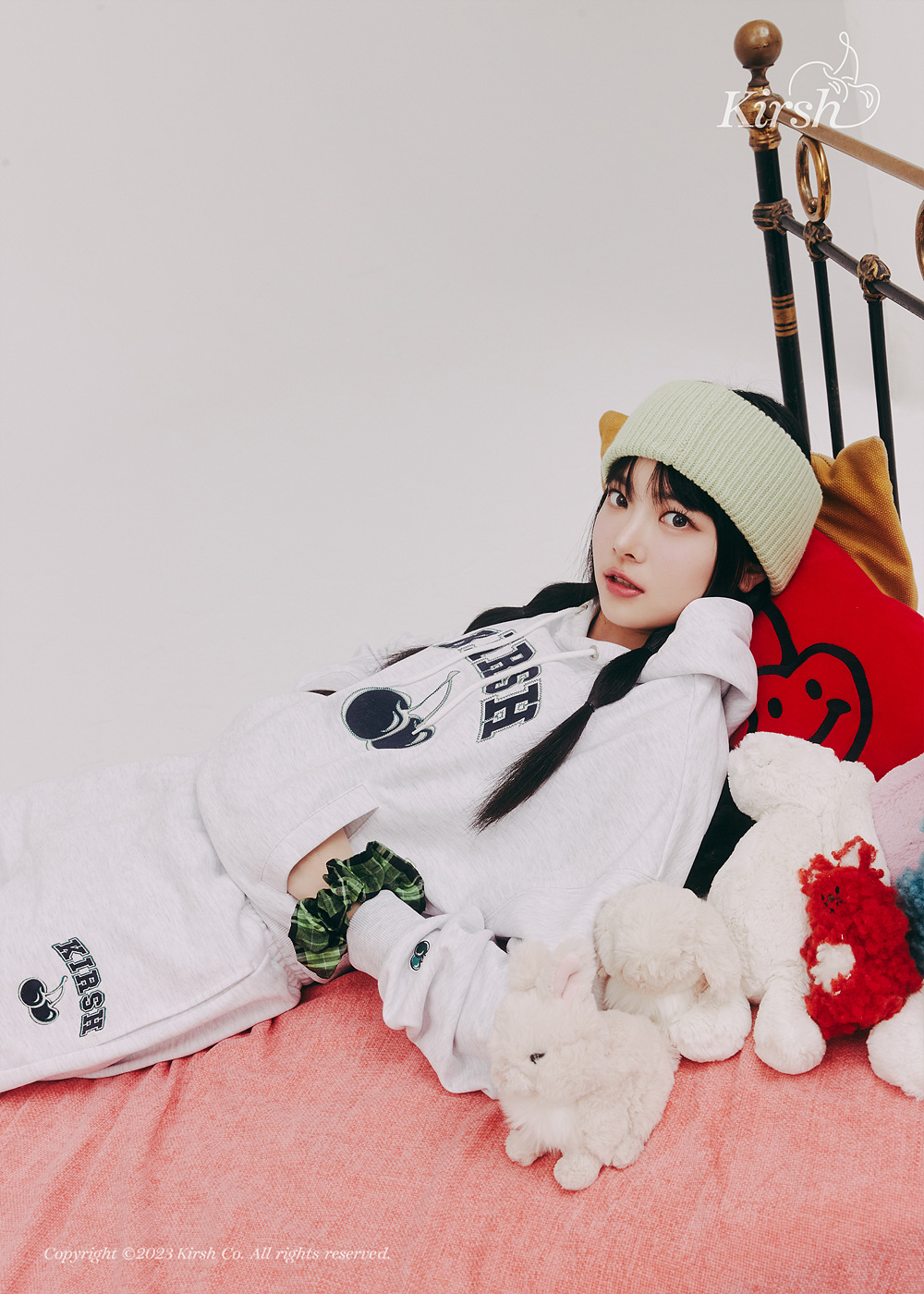 화보 속 홍은채는 특유의 러블리함과 다채로운 표정으로 대체 불가한 매력을 발산하며 '밝게 빛나는 순간'을 완벽하게 소화했다. 키르시의 새로운 캐릭터인 '위티 버니'가 프린트된 크롭 후디를 입고 생기 넘치는 표정을 선보이기도 하고 체리 로고 크롭 후디와 크롭 재킷을 착용하고 셀카를 찍는 장면을 연출하며 톱 모델 못지않은 매력을 발산했다.