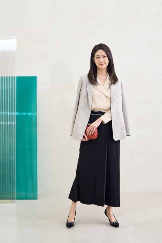 사진 속 이요원은 프릴 셔츠와 봄 재킷을 레이어링 하여 화사한 분위기를 고급스럽게 연출하며 자태를