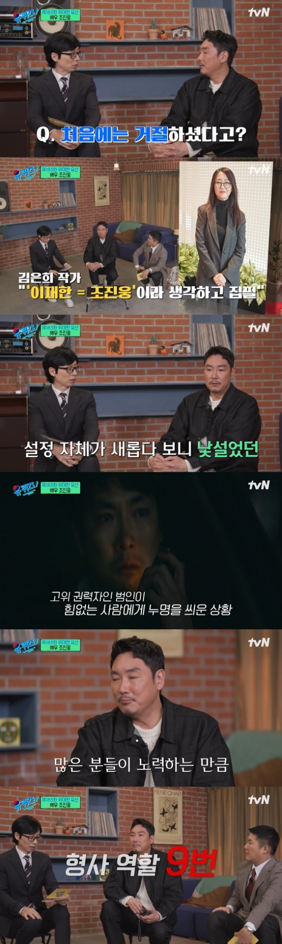 조진웅은 1일 오후 방송된 tvN 예능 프로그램 '유 퀴즈 온 더 블럭'(이하 '유퀴즈')에 출연해 유재석, 조세호와 함께 이야기를 나눴다.