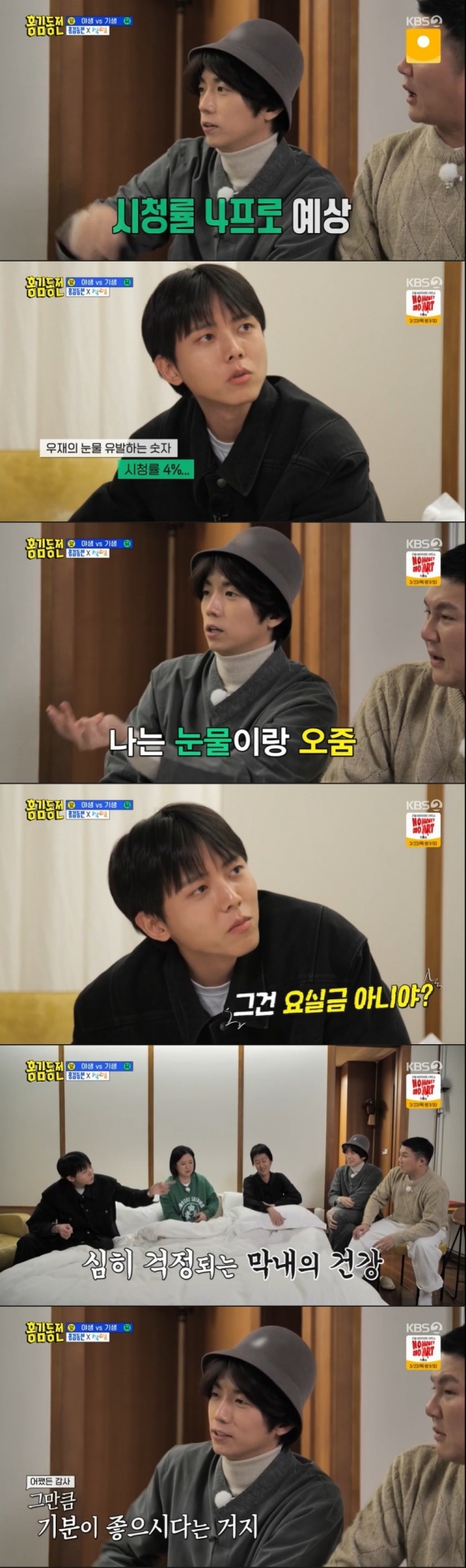 조세호는 "집주인이 밖에서 자는 게 그림은 재밌어"라고 덧붙였다. 이에 주우재는 "누나 밖에서 자잖아. 내가 볼 때 시청률 한 4퍼센트 나와. 나 홍김동전 4퍼센트 찍으면 눈물 찔끔 나올 것 같아"라고 말했고, 장우영은 "나는 눈물이랑 오줌"이라고 말해 모두를 폭소케 했다. 멤버들은 "그건 요실금 아니야?", "치료받아야 돼. 지금 병원 가", "너 약 먹어야 돼 그 정도면"이라고 말하며 장우영을 놀리며 웃음을 자아냈다.