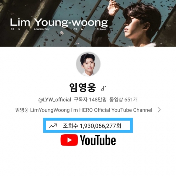 구독자 148만 명의 임영웅 공식 유튜브 채널은 3월 16일 총조회수 19억 3000만 뷰를 넘어섰다. 지난 9일 19억 2000만 뷰 달성 후 일주일 만에 기록 경신을 했다.