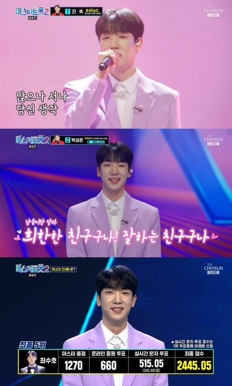 아버지를 향한 진심을 담은 열창으로 레전드 무대를 선사한 최수호는 마스터 점수와 실시간 문자 투표 점수를 합산한 총점 2445.05점으로 최종 5위에 등극, '미스터트롯2'의 기나긴 여정을 성공적으로 마무리했다.