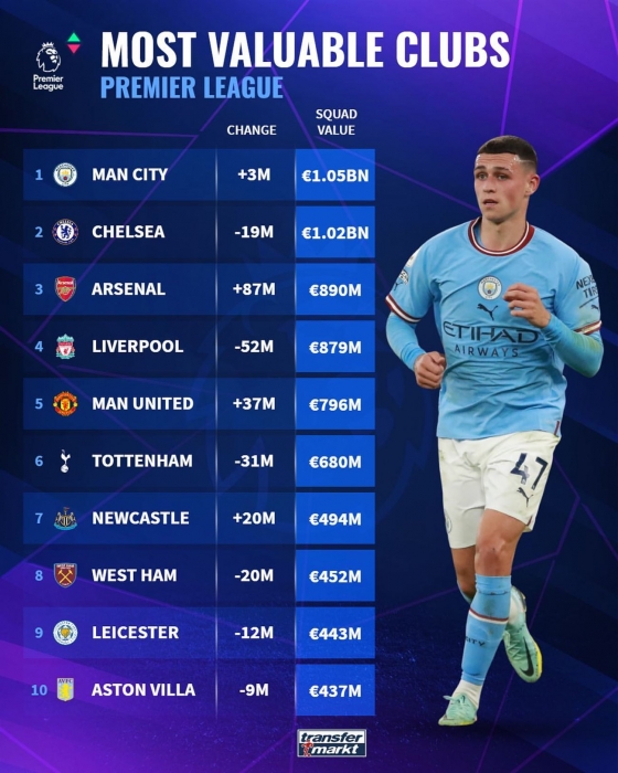 유럽 축구 통계 매체 ‘트랜스퍼마크트’는 17일(한국시간) 2022/2023 잉글리시 프리미어리그(EPL) 20팀 중 상위 10팀의 가치 변화를 나열했다.